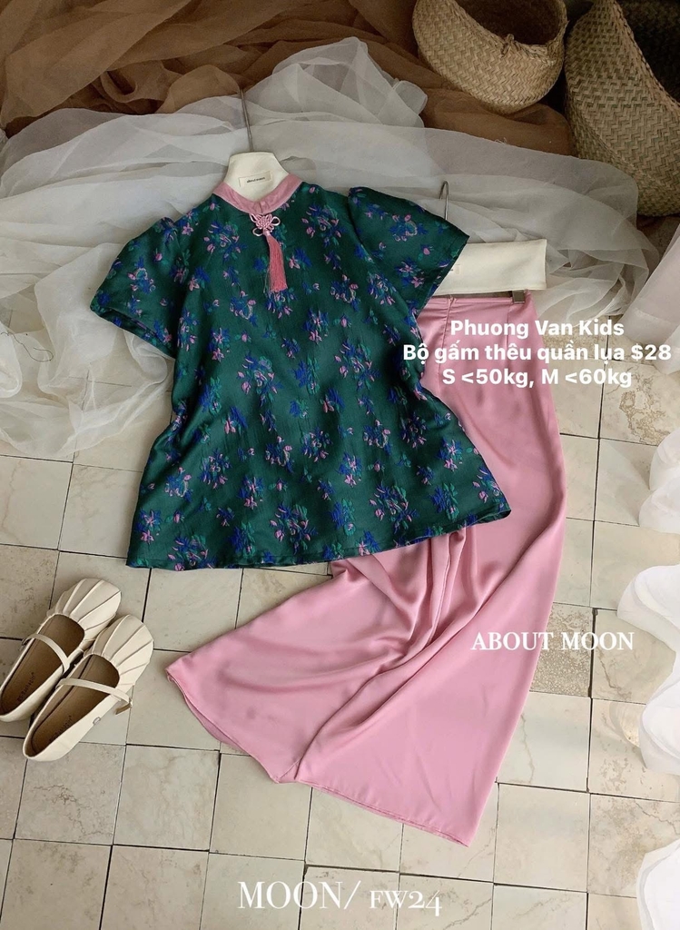 Bộ gấm thêu xanh + quần lụa